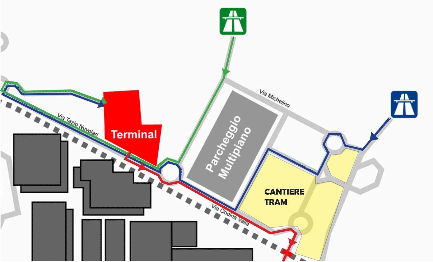 Route from Terminal to Michelino GateVehicles will be allowed to stay inside the fairgrounds for a limited period of time. This service is subject to the payment of a security deposit as explained below.